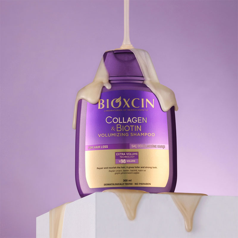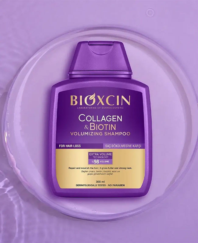 شامپو حجم دهنده بیوکسین Bioxcin حاوی کلاژن و بیوتین COLLAGEN & BIOTIN به طور ویژه برای افزایش حجم و درمان و مبارزه با ریزش مو ها طراحی شده است